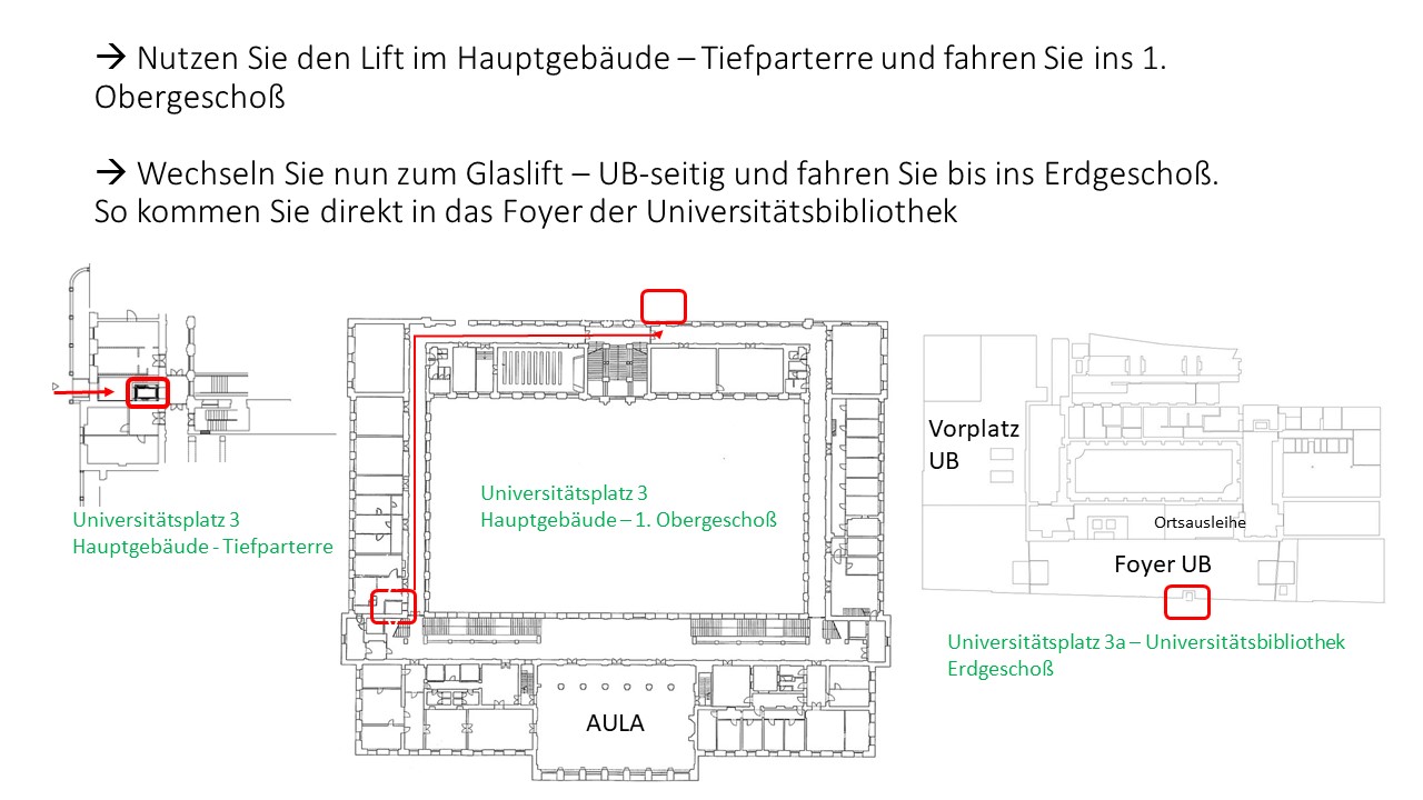 In diesem Zeitraum ist kein barrierefreier Zugang direkt über den Vorplatz zur Universitätsbibliothek möglich. Daher nutzen Sie bitte den Aufzug im Hauptgebäude (Tiefparterre) und fahren Sie bis ins 1. Obergeschoß. Nutzen Sie dann den Glaslift (UB-seitig) und fahren Sie ins Erdgeschoß. Sie kommen direkt in das Foyer der Universitätsbibliothek.