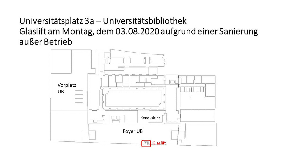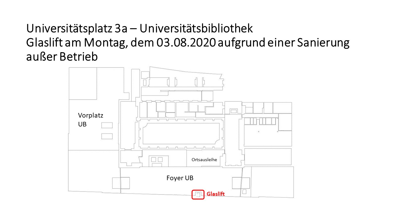 Hiermit teilt Ihnen die Abteilung Gebäude und Technik mit, dass der Glaslift im Universitätsplatz 3a (Universitätsbibliothek) am Montag, dem 03.08.2020 aufgrund einer Sanierung außer Betrieb genommen werden muss.
